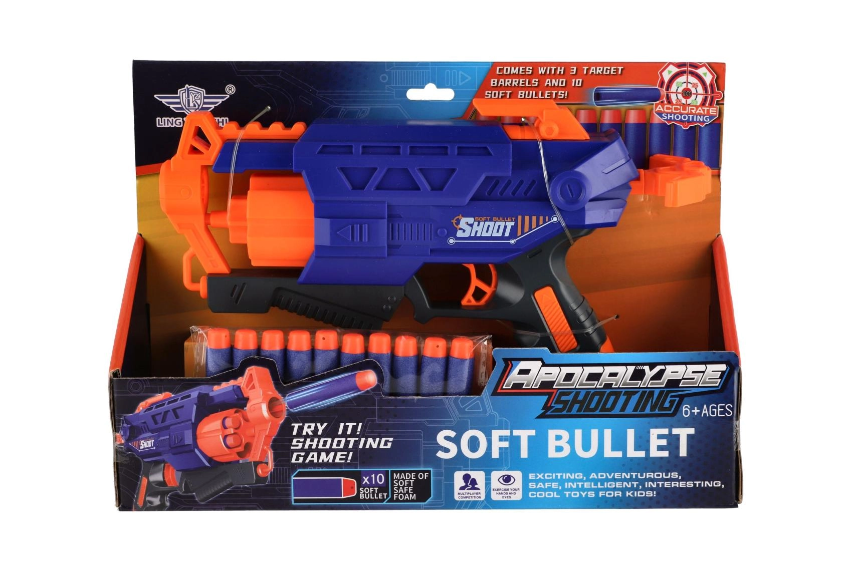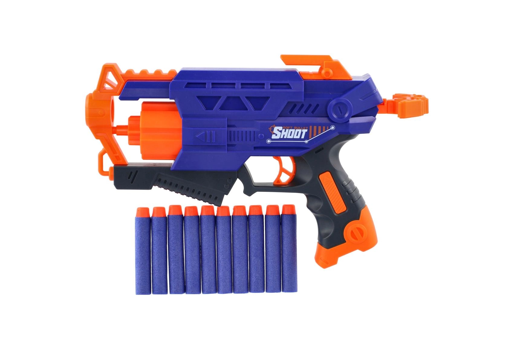 The package includes 10 foam darts and a 28 cm gun, which is easy to hold even in small hands.