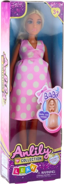 Pregnant Anlily doll with pink dress and removable belly. Perfect for creative play.