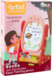 The set includes: Double-sided magnetic board, colored chalks, dry-erase markers, magnets with letters and numbers, ruler – spirograph, eraser, shelf and holder for accessories, a set of educational board games, assembly instructions.