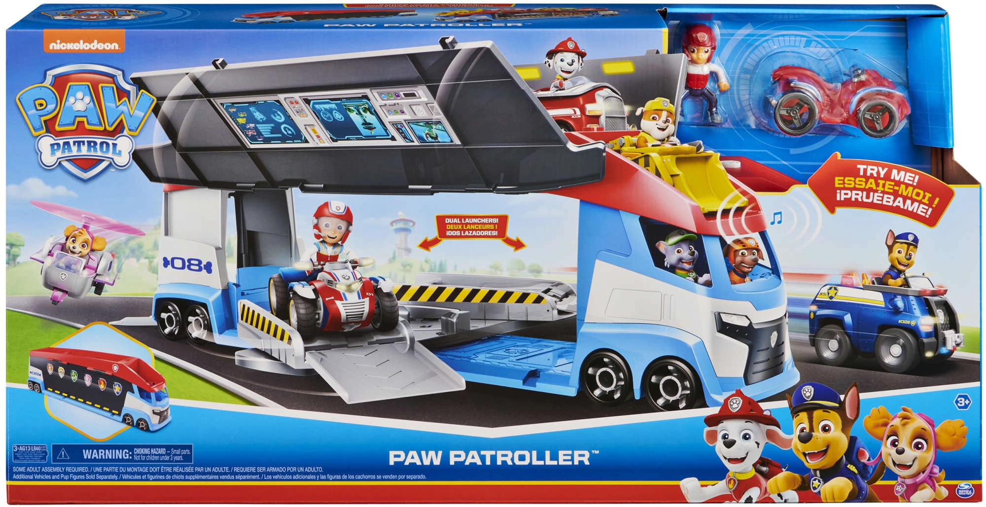 The PAW PATROL Big Patroller 2.0 by Spin Master brings kids action-packed fun on the go. The opening trailer transforms into a play base, holds up to six vehicles, and offers sound effects, extendable ramps, and dual launchers. The set includes a Ryder figure and his ATV—ready for any rescue mission.