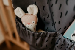 The advantage of the pocket is its high-quality material – 100% polyester with a weight of 172 g/m², it is waterproof, stain-resistant, and abrasion-resistant, making it an ideal choice for the nursery environment. The inner and outer sides of the pocket are washable. Its practical design includes front pockets with a depth of 15 cm and back pockets with a depth of 18 cm, allowing storage of all essentials.