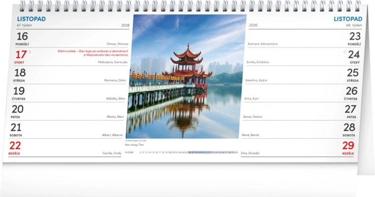 Discover breathtaking cities around the world with this 14-day desk calendar for the year 2026. Includes Czech calendar details, holidays, memorable days, and moon phases in a clear fortnightly layout.