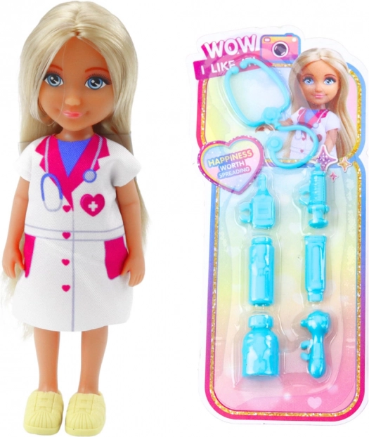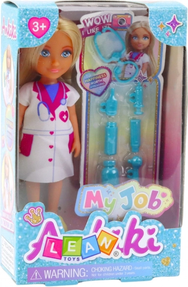 The mini doll doctor is an inspirational toy that introduces children to the world of medicine and caring for others. The doll's outfit with a white doctor's coat and pink pockets gives the toy a professional and cute look, ideal for young doctors.