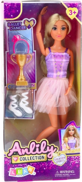The Anlily Doll Ballerina in Dress stands 30 cm tall and is made from safe and durable materials. Her delicate facial features and long blonde hair allow for creating creative hairstyles. The package includes a gold trophy, pink ballet shoes, and a headband, which perfectly complement the doll's dance styling.