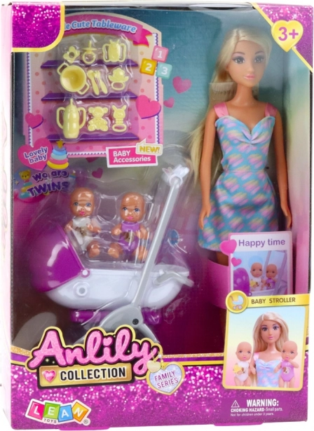 The Anlily doll with children is a beautiful and versatile set that introduces children to the warm world of family scenes and the nurturing care of little babies. The brunette Anlily doll is dressed in colorful summer dresses with orange shoes, making her ideal for daily adventures as a mom or caregiver. The set includes two babies, which you can place in a classic pram with movable wheels and an opening hood for realistic play.