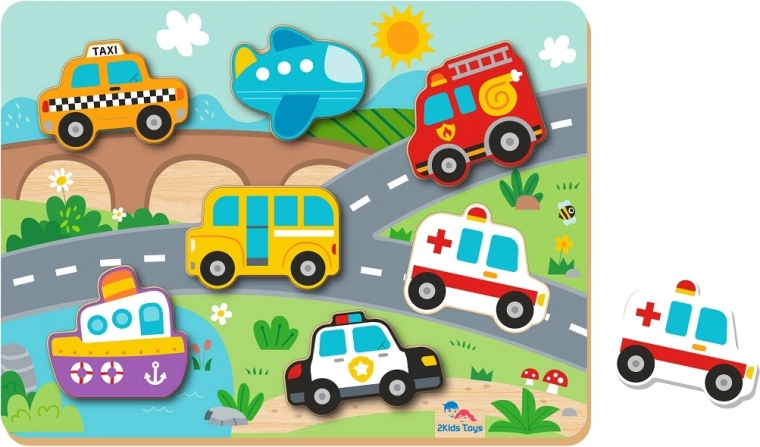 This insert puzzle is a great tool for developing fine motor skills and learning about means of transport in children. It contains 7 insert pieces and colorful illustrations, making this toy not only a fun element but also a beautiful decoration for a child's room.