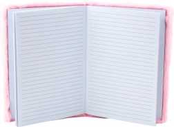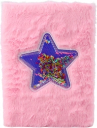 The cover is made of soft, pleasant material in an intense pink color. In the center, there is a transparent star-shaped application, inside which are colorful confetti that move freely with every movement of the notebook. This detail distinguishes the product from classic notebooks.