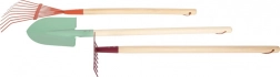 With this four-piece garden tool set "Tiny Garden" and trendy watering can you can get into action – whether in the garden, sandbox, or at the beach! The set includes a rake, spade, leaf rake, and a watering can with a practical sprayer. The tools are made of durable materials and perfectly sized for little hands. And when the work is done? Thanks to loops at the end of the handles, it can be easily hung up and stored.