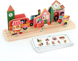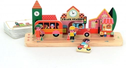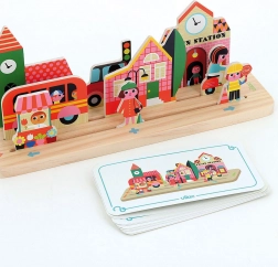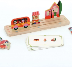This wooden logical puzzle with beautiful illustrations by Ingela P. Arrhenius playfully develops children's skills. Using wooden pieces and playing cards, children learn to perceive relations between objects, such as left, right, above, below, and middle, and place them correctly according to the task.