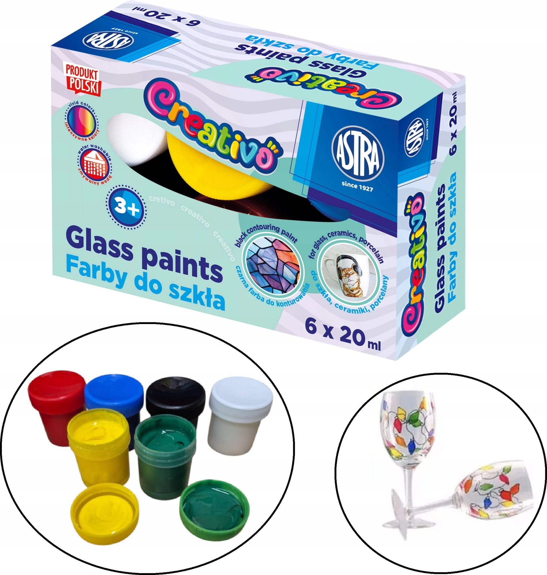 Semi-transparent ASTRA CREATIVO glass paints in a 6×20 ml set are ideal for creative crafting and unique decorations. Suitable for glass, ceramics, and porcelain, they are easy to use and deliver beautiful results—perfect for DIY projects, gifts, and art activities with children.