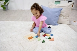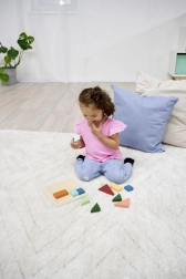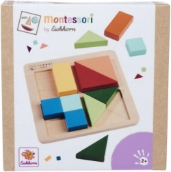 This Montessori puzzle offers children a fun challenge: arrange various shapes to fill the square area. The pieces can also be freely mixed between the squares to create new color combinations, extending playtime and stimulating creativity.