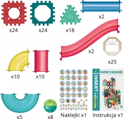 The large set of 128 pieces offers a wide range of shapes and colors for both simple and advanced projects. Transparent elements let you follow the movement of the balls and naturally illustrate the laws of speed, gravity, and inertia. Play develops creativity, patience, and technical skills.