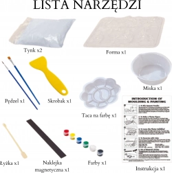 - Complete kit: molds, plaster, paints, brushes, and accessories including instructions.