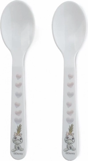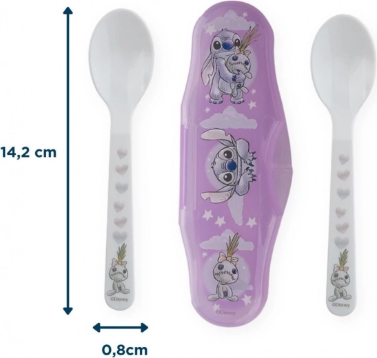 Children's set of two spoons with Lilo & Stitch case. Ergonomic, hygienic, BPA-free, complies with EN 14372. Ideal for travel and preschool.