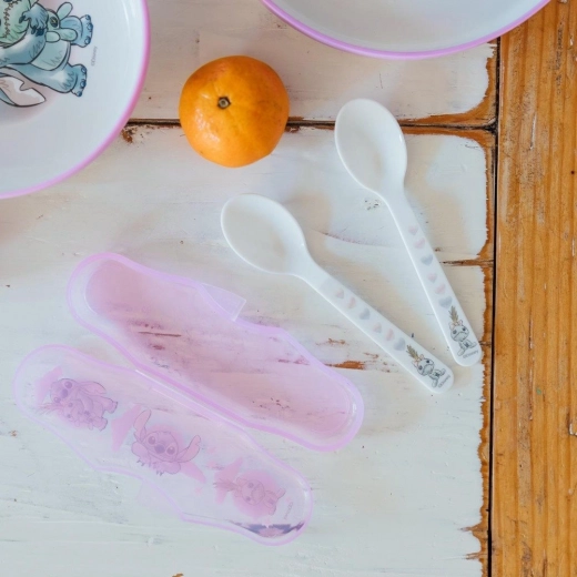 A practical set of two children's spoons with a case featuring the Lilo & Stitch motif, ideal for travel and preschool. The ergonomic shape fits little hands perfectly, the travel case keeps the spoons clean and hygienic, and the material is BPA-free. Complies with EN 14372.