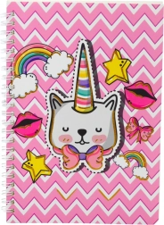 This stylish and practical notebook combines functionality with a playful design. The pink cover with a zigzag pattern and motifs like rainbows, stars, lips, and bows catches the eye and adds a touch of magic to every writing session. The main illustration is a cat with a unicorn horn, giving the notebook a fairytale vibe.