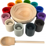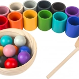 Discover a creative Montessori color-sorting set that teaches children to recognize colors through play while developing fine motor skills and hand-eye coordination. The set includes balls, cups, a bowl, and a spoon made from 100% FSC-certified wood. Ideal for sensory development, focus, and patience thanks to its vibrant colors and engaging activities.
