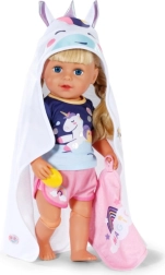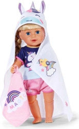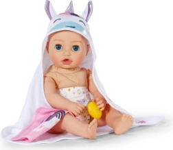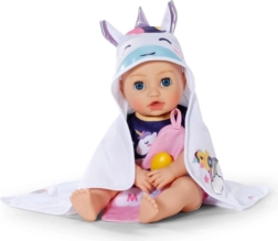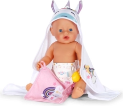 Treat your doll to maximum comfort after bath time with this adorable BABY born towel set. It includes two super-soft pieces with a unicorn and rainbow motif, plus a hood with a print and little ears. Ideal for dolls sized 36 cm and 43 cm. Soft material, a magical unicorn design, and a practical hood for stylish drying and play.