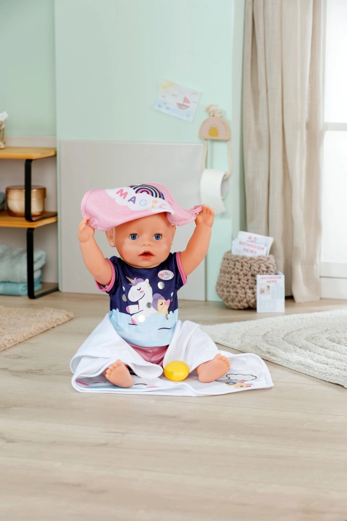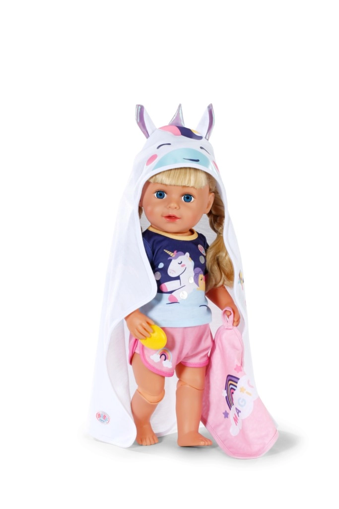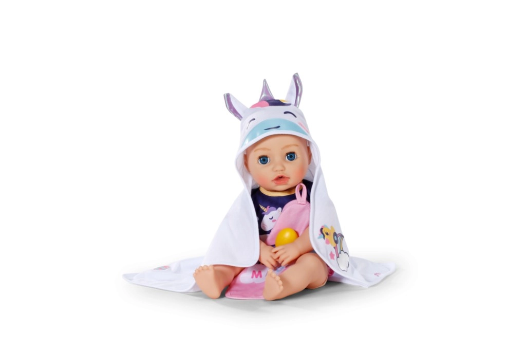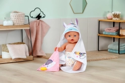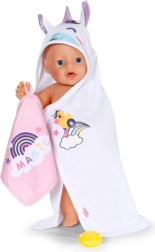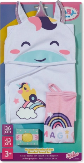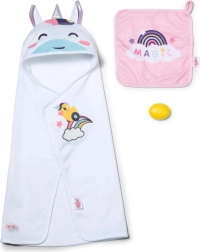 This magical BABY born towel set brings everything you need for fun bath-time routines. Two towels with rainbow and unicorn motifs will delight every little caregiver, while the hood with a rainbow horn and cute ears adds a cheerful touch to every drying session.