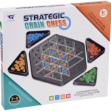 Chain Chess is an original board game in which players take turns stretching colored rubber bands between pegs on the game board. Each new band must be straight, touch at least one previously placed band, and extend into a new column of the board. Once you close a triangle, mark it with your token. The game ends when no new triangles can be formed — the winner is the player with the most claimed shapes.