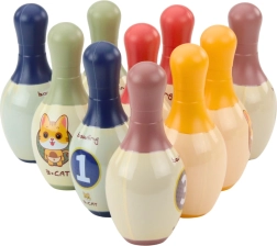 A colorful kids' bowling set with cute kitten designs brings active and joyful fun at home or in the garden. It includes 10 lightweight, numbered pins and 2 balls with finger holes for little hands. The safe, lightweight plastic design supports the development of coordination, accuracy, and concentration.