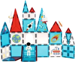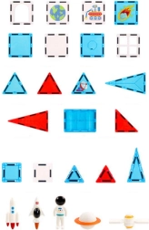 Discover a creative world with space-inspired magnetic building sets. Strong magnets ensure stable structures, and the varied shapes support creativity, logical thinking, and fine motor skills. The 58-piece set with an astronaut, rocket, and decorative tiles lets kids build fantastic space bases and vehicles.