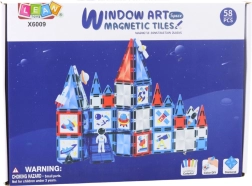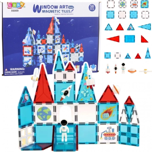 58 magnetic pieces in various shapes and colors, astronaut figure, rocket, decorative tiles with space motifs
