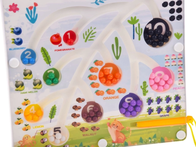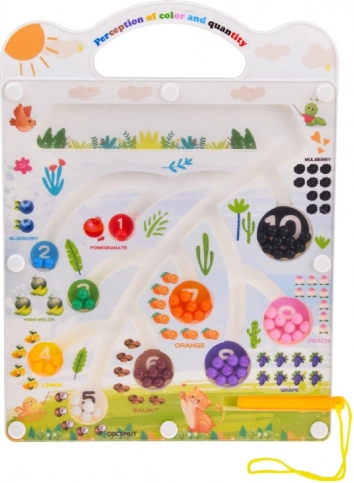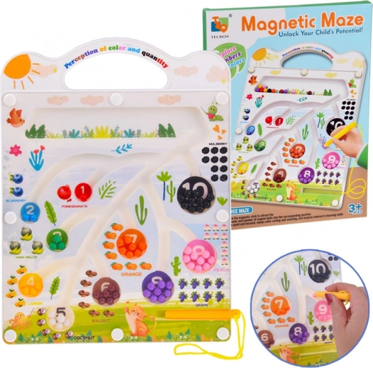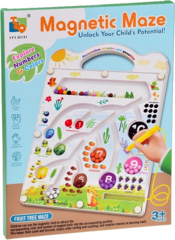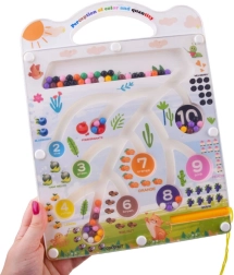 The magnetic maze board is a great educational tool for preschoolers. Colorful beads are guided by a magnetic stylus through tracks to themed openings. Along the way, children learn colors, first digits, and counting, while developing logic and patience. Thanks to the transparent cover, all small pieces remain safely inside.