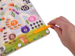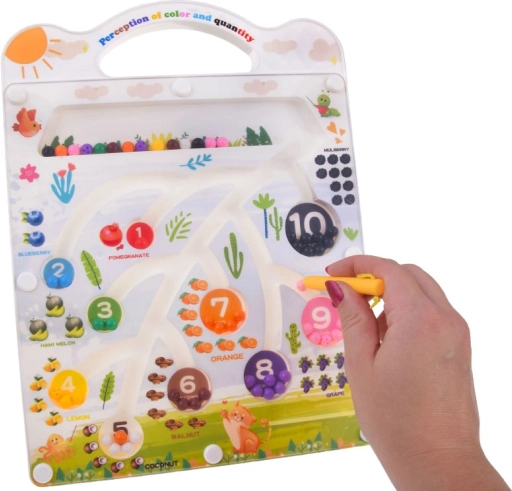 An interactive magnetic maze board that supports skill development through play. Using a magnetic stylus, the child moves beads into the correct slots while practicing color recognition, counting to 10, and sorting. All beads are enclosed under a transparent cover, so nothing gets lost and the toy is safe even for younger children.