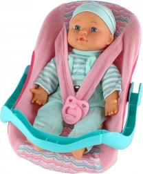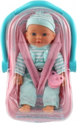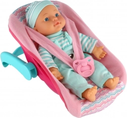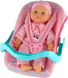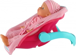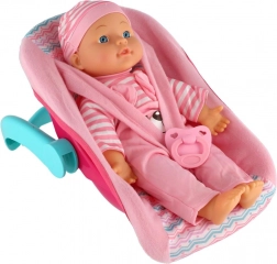 The set includes a practical carrier/car seat with a comfortable handle and safety straps, making it easy to carry the doll, sit it up, or gently rock it. A pacifier is also included—an ideal accessory for soothing and bedtime. Playing with the doll supports the development of fine motor skills, communication, and empathy.