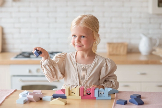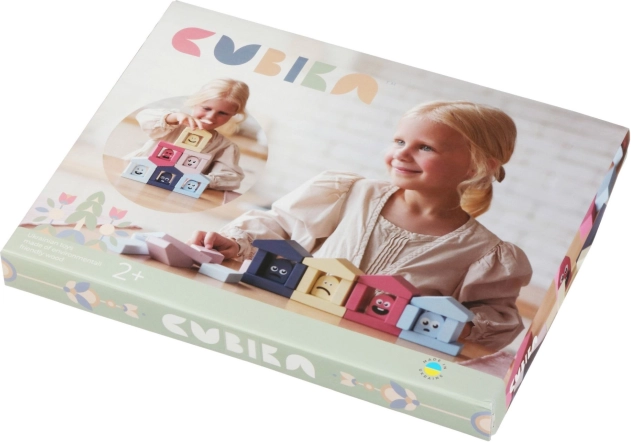 Discover the creative CUBIKA wooden building set in soft pastel colors with 30 elements, including blocks with emojis. Build six houses, each with its own resident in the matching color – children naturally practice color recognition, fine motor skills, and logical thinking while playing. The toy is made from high-quality maple and beech, uses safe water-based paints, and meets the EN 71 standard. 30 pieces, pastel colors, color learning, safe materials, from 24 months, made in Europe.