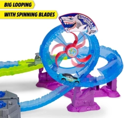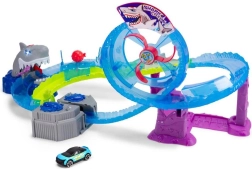 A fun race track with the WHITE SHARK theme delivers a thrilling ride with a loop, turbo booster, and impressive light and sound effects. Includes a metal car, an action-packed pass through a water tunnel, and the unexpected snap of a great white shark’s jaws.