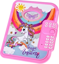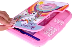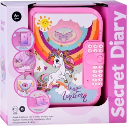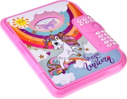Discover the magic of your own secrets with an interactive unicorn-themed diary. Thanks to the four-digit code, all notes and little items are securely protected. The diary offers 6 function buttons, voice recording and playback, voice changer, and 10 built-in melodies. It includes a pink notepad, a marker, and a hidden compartment for treasures.