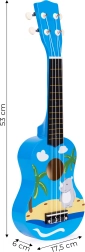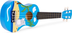 Spark kids' imagination with the ECOTOYS ukulele – a lightweight wooden instrument for little musicians from 3 years. It features 4 nylon strings, tuning machines, 12 frets for more precise playing, and comfortable strumming with the included pick. The colorful island motif captivates at first glance and the instrument develops fine motor skills, creativity, and musical sense.