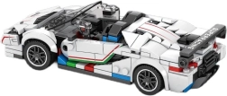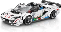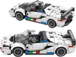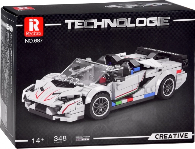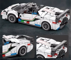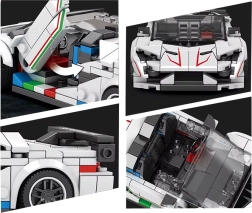 Build your own white supercar convertible with a spoiler from 348 pieces. The model stands out with its aerodynamic design, low profile, and sport wheels. Ideal for fans of engineering building sets and modern automotive aesthetics – medium difficulty build for ages 14+.