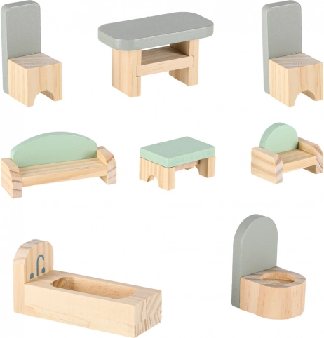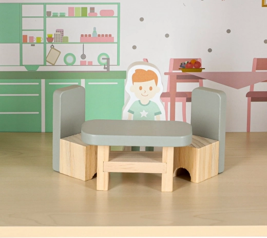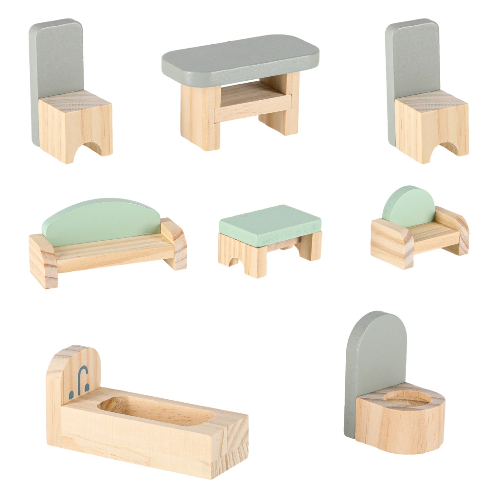 Includes a bed, cabinet, sofa set, table with chairs, and bathroom fixtures. Two wooden figurines encourage role play and creativity.