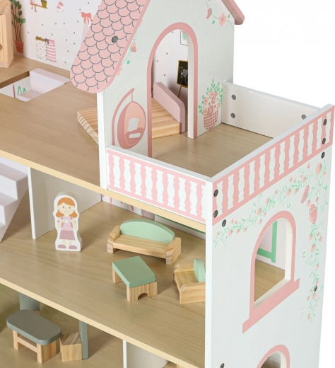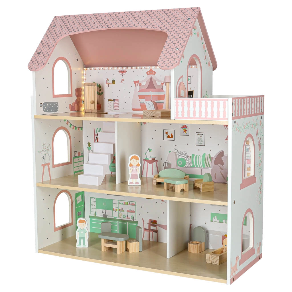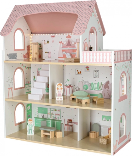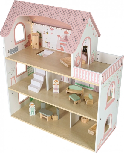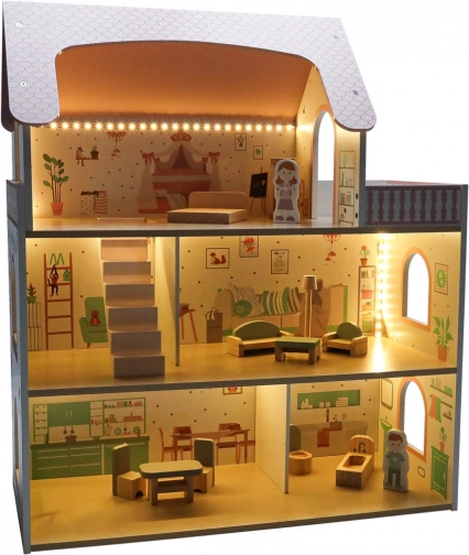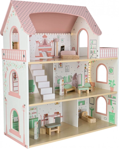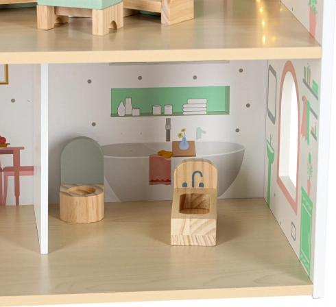 The Lulilo Peonio dollhouse is a beautiful three-story home in a pink–mint color combination with printed interiors, a staircase, and a balcony. Warm LED lights create a magical evening atmosphere and make every room cozy. Thanks to the extensive furniture set, kids can easily furnish the bedroom, living room, kitchen, and bathroom.