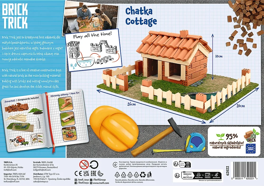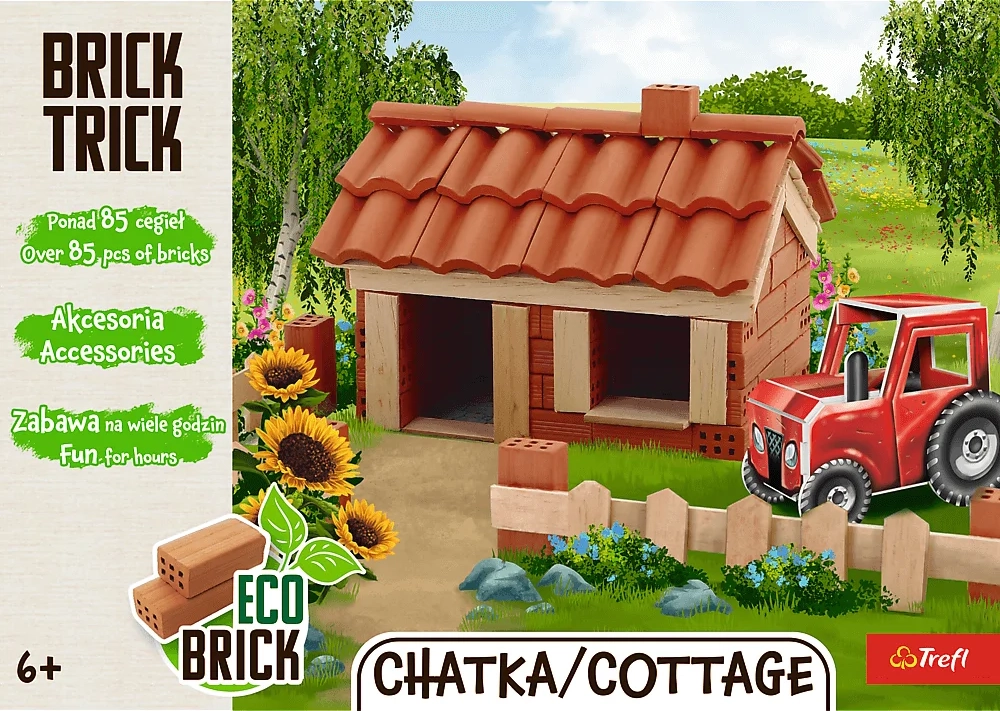Discover the Trefl Brick Trick Eco Cottage set that lets children build step by step from the foundations to the finished model with roof, fence, and yard. Real mini bricks, wood, and decorative accessories create an authentic look of a small country house. Bring the finished build to life with paper figures and themed accessories.