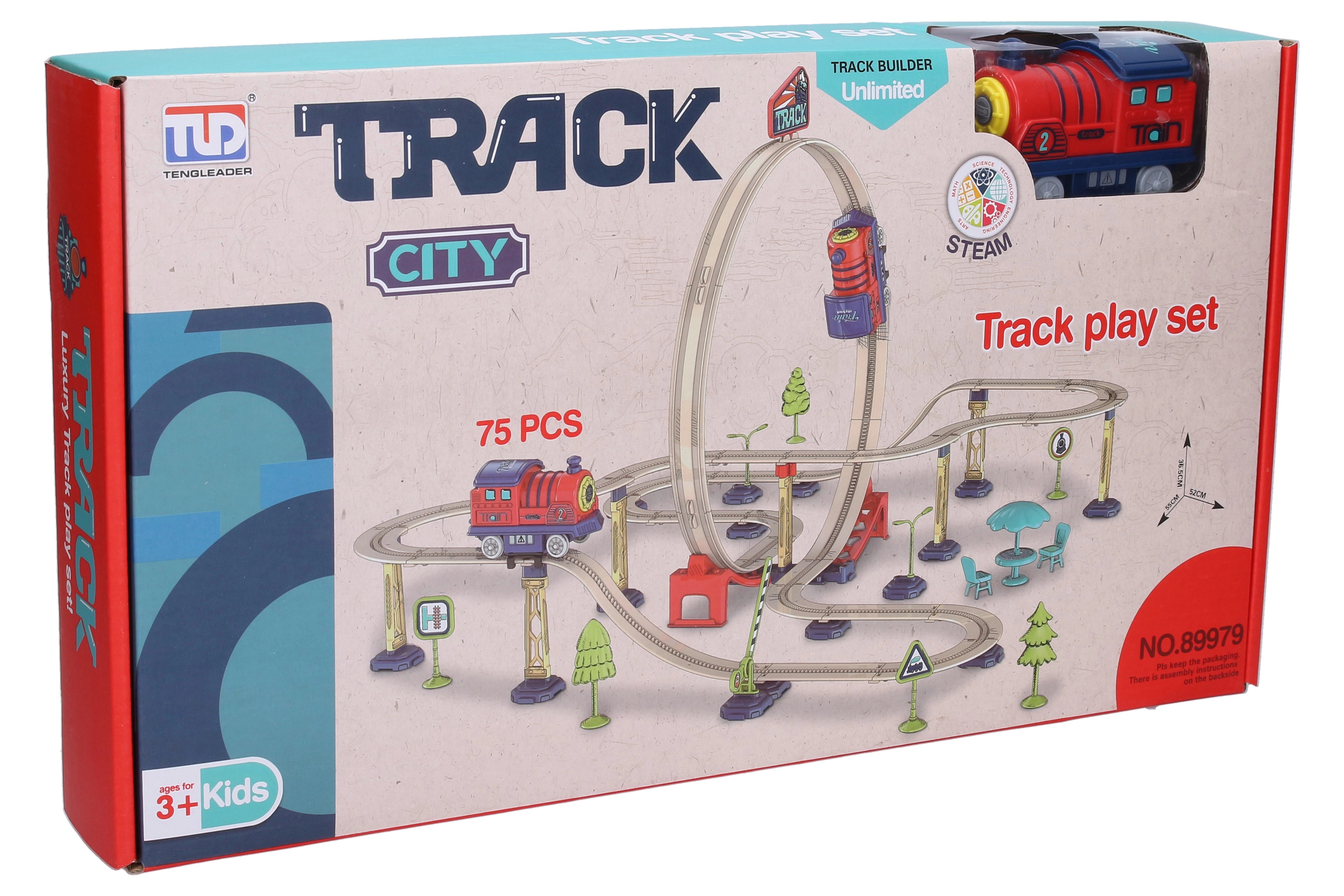 The assembled track measures 55 × 52 × 36.5 cm, so it fits comfortably on a table or in a play corner. The 75-piece set allows flexible building, and kids can enjoy an exciting loop run. To get the engine running, simply insert 2 × AAA batteries (not included) and follow the clear instructions on the packaging.