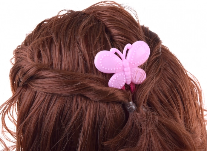 A cute pink butterfly-shaped clip reliably holds strands and adds a playful accent to finished hairstyles.