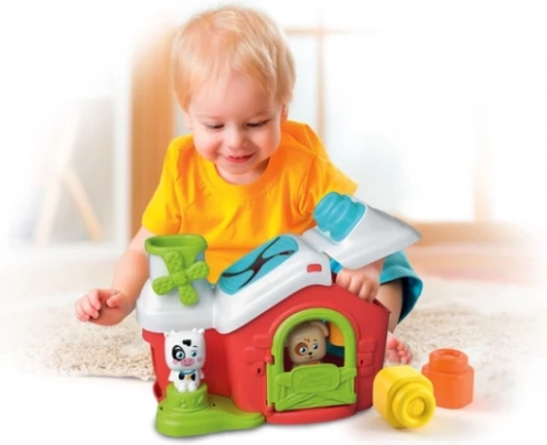 Kids will also enjoy the mechanical elements: the chimney has a “press and pop out” function where a block slides out through a side opening, and the windmill spins with a gentle touch. Sensory textures on the surface support tactile development, while sorting and manipulating the blocks build hand–eye coordination and fine motor skills. The farm-themed setting with characters encourages creative play and storytelling.