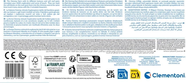 Clemmy Sensory Farm by CLEMENTONI: soft blocks, sorter, mechanical elements, and textures to develop motor skills and imagination. For children 6–36 months, no batteries.