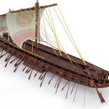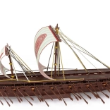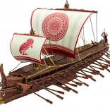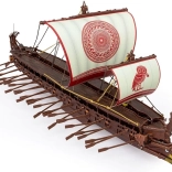 Fine lines of the sails, hull planking, and deck elements are cut and engraved with high precision for an authentic trireme appearance.