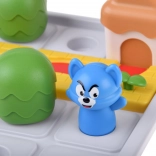 Sturdy plastic components with rounded edges — path tiles, cheese house, trees, and mouse and cat figures — support fine motor skills and easy handling.
