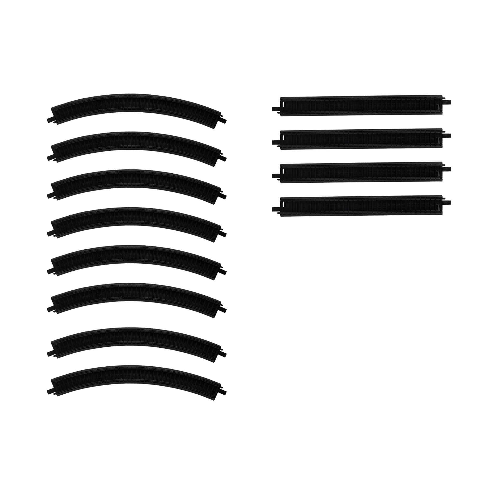 The set includes curved and straight tracks to assemble a closed circuit for continuous train running.