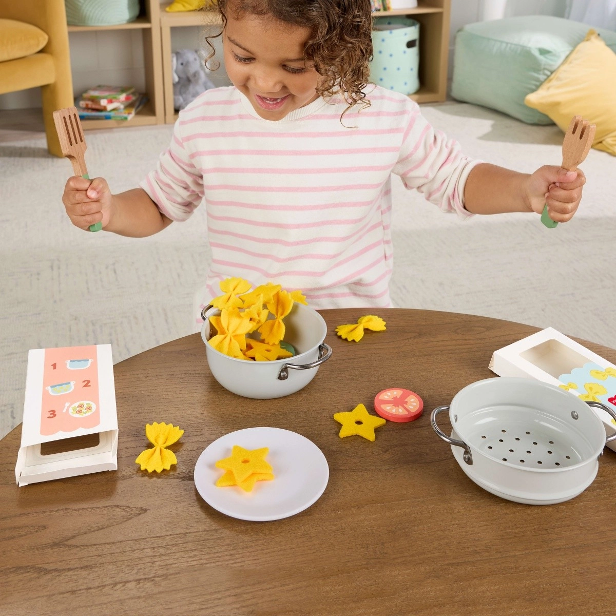 Discover the magic of cooking play with a quality Fisher-Price set that combines metal pots, wooden utensils, and soft felt pasta. Kids will enjoy stirring, straining, and serving while learning the basics of table manners and cooperation.