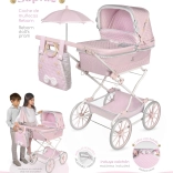 The rich set includes a folding parasol, a decorative detachable bag, a carrycot cover with snaps and pockets, a soft mattress, and a plush blanket. A practical lower storage basket provides space for accessories. The sturdy metal construction combined with textile and plastic ensures durability and easy maintenance. The model folds compactly and is suitable for both indoor and outdoor play.