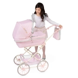 Light pink finish with decorative bows and lace. Includes a parasol, bag, carrycot cover, mattress, and a soft blanket.