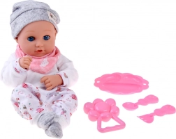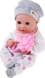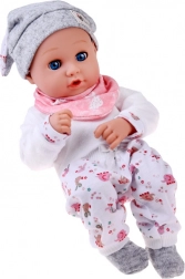 This doll is made from a pleasant, soft material with a plastic head and hands for durability. The outfit in gentle colors includes a gray hat, soft blouse, patterned pants, and gray socks. Thanks to the moving eyelids, the doll convincingly imitates sleeping and waking, encouraging natural care and empathy.