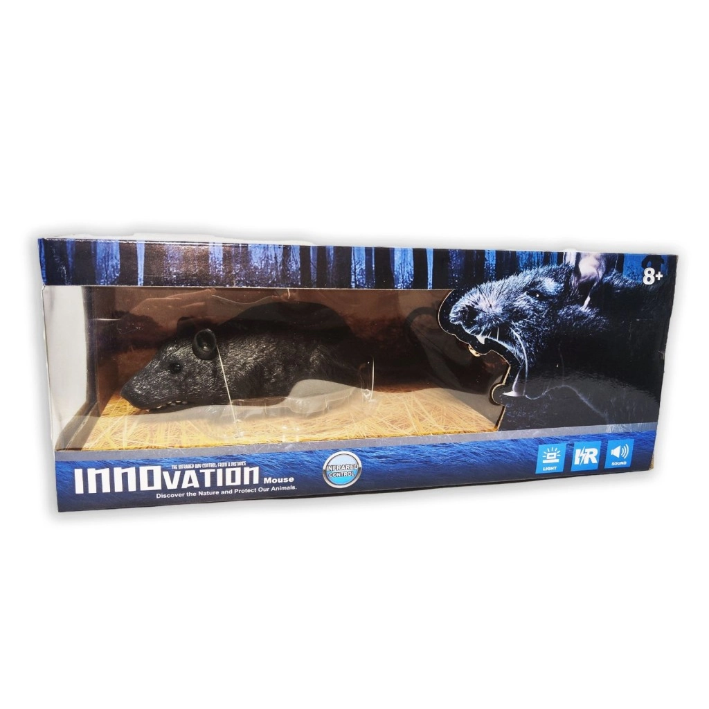 A fun and realistic RC rat with infrared control that delights pranksters and toy lovers big and small. It features glowing eyes, forward drive, opening mouth, and a demo motion mode. The controller has a range of up to 8 m, and the toy provides approximately 30 minutes of playtime. Ideal for children aged 6 and up.